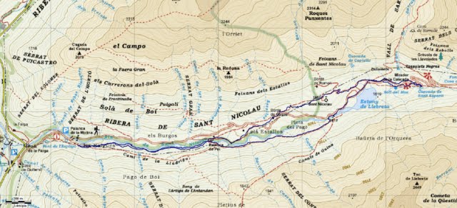 Vam deixar el cotxe a Boí, i vam agafar els taxis que van pel parc nacional, amb ell vam recorre la zona que haviem fet ahir, de la Vall de St. Nicolau. Va anar bé d'agafar-lo, perquè ens va deixar, una miqueta més amunt del que haviem caminar ahir, és a dir que fariem caminant desde el Planell d'Aigüestortes, fins l'Estany Llong.